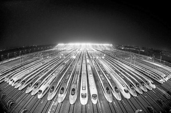 春運前夕,高鐵列車在武漢車站排隊等待維護。