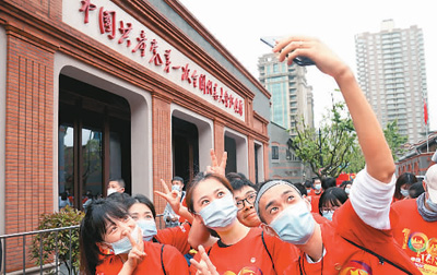 5月4日,在上海中共一大紀(jì)念館國旗廣場,參加“五四”主題集會的青年們在自拍合影。