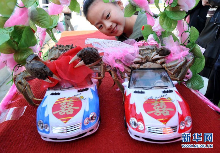 2011年10月5日,在江蘇洪澤湖大閘蟹節(jié)趣味賽蟹活動(dòng)“螃蟹寵物秀”上,小朋友觀看參賽的“蟹新郎、蟹新娘坐婚車”。 新華社記者孫參攝