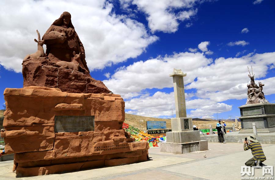 游客在昆侖山口的可可西里自然保護(hù)區(qū)藏羚羊雕塑前留影(央廣網(wǎng)記者 張雷 攝)
