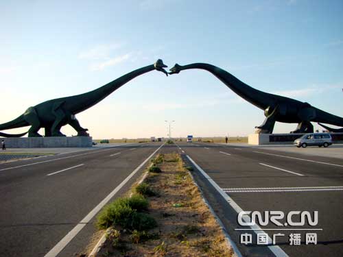 記者曾與2005年8月來過這里,然而三年過去了,當(dāng)記者再次驅(qū)車駛進(jìn)這座城市時,不禁為二連短短幾年的巨大發(fā)展變化感到吃驚。在當(dāng)時還未竣工的通往二連的公路上,如今在即將進(jìn)入二連時,拔地而起一座壯觀的恐龍門立于大道的中央。在一側(cè)恐龍的基座上中蒙文的“中國.二連浩特” 幾個大字在夕陽的照耀下金光閃閃。穿過恐龍門后道路兩側(cè)的草原上分布著98座銅制的各種恐龍的造型。