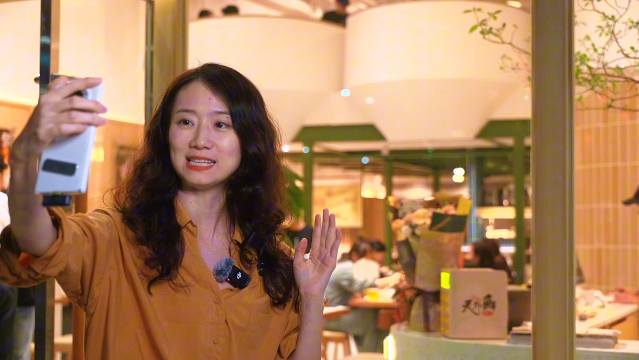 天外鮮斑魚海鮮粥火鍋創(chuàng)始人魯妮正在新店門口直播