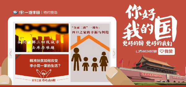 在“兩會”報道中,搜狐網(wǎng)率先嘗試改變“高大上”的宏觀敘事基調(diào),大膽將“你”和“我”這兩個字,運用到門戶網(wǎng)站的“兩會”主題里,推出“你好,我的國”大型主題策劃。同時,圍繞“移動端”推出的諸多數(shù)字互動產(chǎn)品,也讓網(wǎng)友更有親切感和現(xiàn)場感,對“兩會”動態(tài)有更全面、深度的了解。