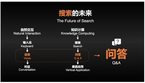 王小川進(jìn)一步談到在自然交互和知識(shí)計(jì)算領(lǐng)域,產(chǎn)品如何進(jìn)行應(yīng)用落地。他以搜狗的產(chǎn)品為例進(jìn)行解讀,“搜狗有兩個(gè)核心產(chǎn)品,一個(gè)是輸入法,一個(gè)是搜索引擎。隨著人工智能的到來,也分別有相應(yīng)的突破:在自然交互里面,輸入法會(huì)變成語音輸入,然后走向?qū)υ;另一方面是搜索,作為知識(shí)計(jì)算的引擎,走向問答”。