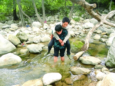 學校坐落在公路邊。橫穿公路,沿石塊壘起的陡坡小心下行,是一條雨季蹚水旱季踩石才能渡過的小河。對岸山坡上彎曲狹窄的小路,顯然是腳踩出來的,走過兩公里之后,才來到一處土坯壘起的房屋,這是杜廣云的家。半身癱瘓的杜廣云,就是由妻子背著,一次次沿這條路往返,支撐起伏牛山深處一所小學的全部教學。