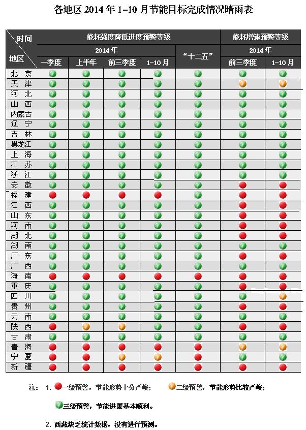 央廣網(wǎng)北京12月3日消息 近日,國家發(fā)布了各地區(qū)2014年1-10月節(jié)能目標(biāo)完成情況晴雨表。通過對(duì)各地區(qū)節(jié)能形勢(shì)進(jìn)行分析,對(duì)照各地“十二五”年均節(jié)能任務(wù),1-10月,福建、海南、青海、新疆等4個(gè)地區(qū)預(yù)警等級(jí)為一級(jí),節(jié)能形勢(shì)十分嚴(yán)峻;寧夏地區(qū)預(yù)警等級(jí)為二級(jí),節(jié)能形勢(shì)比較嚴(yán)峻;北京、天津、河北、山西、內(nèi)蒙古、遼寧、吉林、黑龍江、上海、江蘇、浙江、安徽、江西、山東、河南、湖北、湖南、廣東、廣西、重慶、四川、貴州、云南、陜西、甘肅等25個(gè)地區(qū)預(yù)警等級(jí)為三級(jí),節(jié)能工作進(jìn)展基本順利。與前三季度相比,陜西由二級(jí)預(yù)警下降為三級(jí)預(yù)警。西藏缺乏統(tǒng)計(jì)數(shù)據(jù),沒有進(jìn)行預(yù)測(cè)。