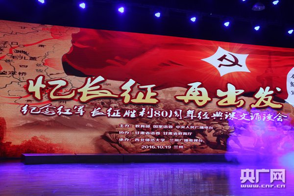 央廣網(wǎng)蘭州20日消息(記者 王丹蕾) 19日,由教育部、國(guó)家語(yǔ)言文字工作委員會(huì)、中央人民廣播電臺(tái)主辦,甘肅省教育廳、甘肅省語(yǔ)言文字工作委員會(huì)協(xié)辦,西北師范大學(xué)、蘭州廣播電視臺(tái)承辦的“憶長(zhǎng)征 再出發(fā)——紀(jì)念紅軍長(zhǎng)征勝利80周年經(jīng)典課文誦讀會(huì)”在西北師范大學(xué)音樂(lè)廳舉行。