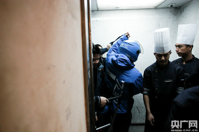 很多高檔寫字樓,需要劃單位的門卡才能坐客梯上樓。所以,像趙慶富這些送外賣、送快遞小哥一般都只能坐貨梯。每到送餐高峰期間,貨梯的速度很慢,一棟寫字樓又往往有很多層都有訂餐!盀榱斯(jié)省時(shí)間,我很多時(shí)候就直接爬樓梯,最高曾一口氣爬到過20多層”。