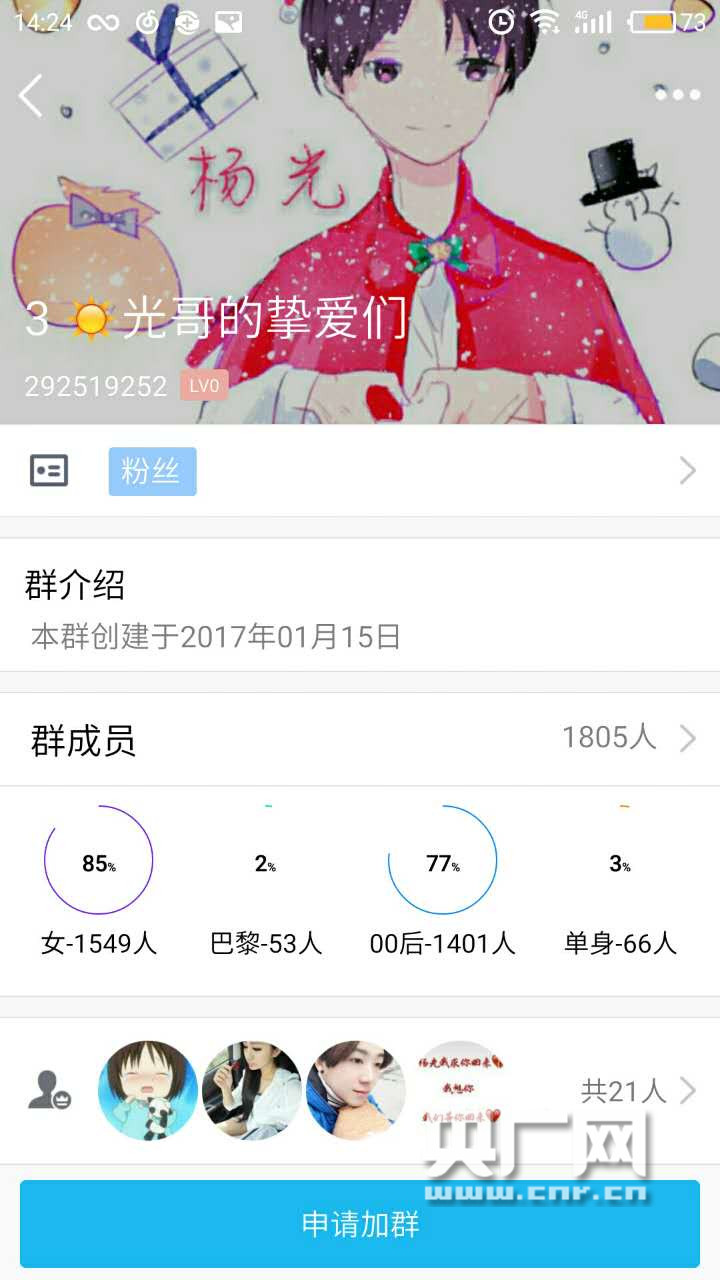 記者轉(zhuǎn)變方式,想要加入粉絲群側(cè)面了解情況,但直至截稿前也未得到同意進(jìn)入該群。記者通過查看群資料發(fā)現(xiàn),這個粉絲群共1805名成員,其中女性占85%,共1549人,“00后”占77%,共記1401人。