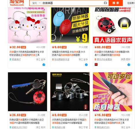 記者在淘寶上鍵入“防狼神器”一詞,除了防狼噴霧、噴火防狼神器之外,銷量在前幾位的還有防狼戒指、強光手電等。除上述提到的具有一定攻擊性的武器,如防狼噴霧、袖珍短棍、防狼筆等。記者注意到,網上出售的防狼工具,大多小巧便攜,攻擊性小,傾向于防護。