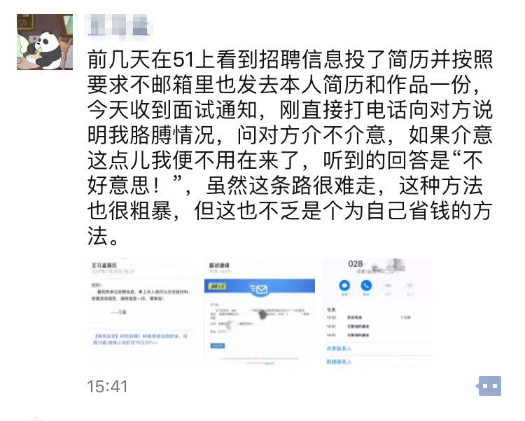 這天深夜,他更新了一條朋友圈:在講述了自己因身體缺陷而被拒之門外的求職之旅后,他不無自嘲地寫:雖然這條路很難走,這種方法(電話告知對(duì)方身體缺陷)也很粗暴,但也不失是個(gè)為自己省錢的方法!