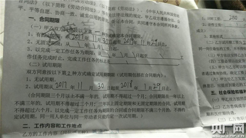 根據(jù)趙程提供的勞務(wù)合同照片,記者看到合同期限一欄明確寫(xiě)有“有固定期限:從2017年11月30日起至2019年11月29日止。試用期限從2017年11月30日到起至2018年1月29日止!