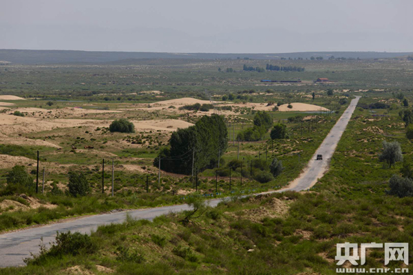 庫布其沙漠第一條穿沙公路是沙區(qū)人民破解生存危機的利器,更刻下一代代治沙人追尋綠色的印記(攝于7月26日)。(央廣網(wǎng)記者 張凱航 攝)