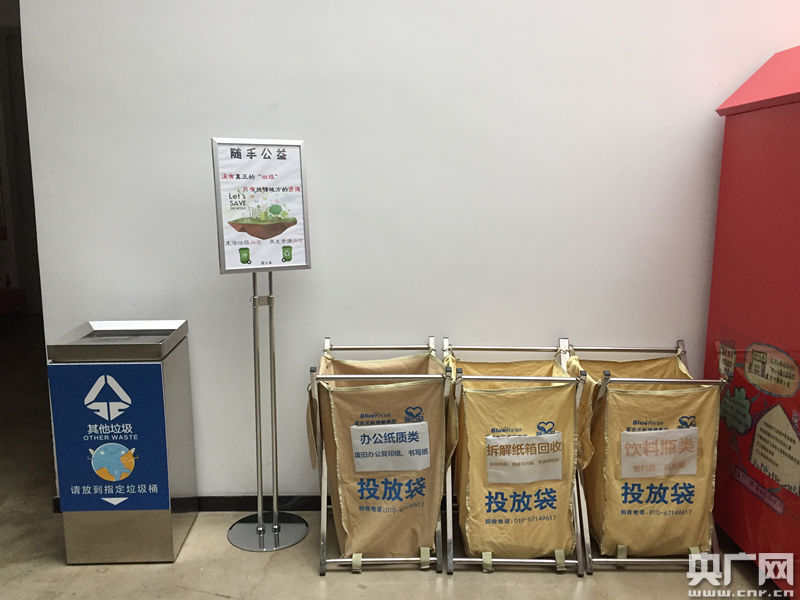 記者在藍(lán)色光標(biāo)參觀時(shí)發(fā)現(xiàn),在大樓進(jìn)出口、電梯口、辦公區(qū)和人群聚集區(qū)域內(nèi),均設(shè)置了不同門類的垃圾投放袋,主要包括白色辦公廢紙類、報(bào)紙類、雜志書本類、箱板類、飲料瓶類等。員工也都自覺把垃圾按門類分裝包好才扔進(jìn)不同的垃圾箱內(nèi)。