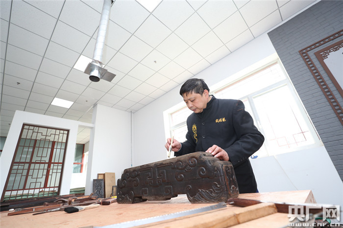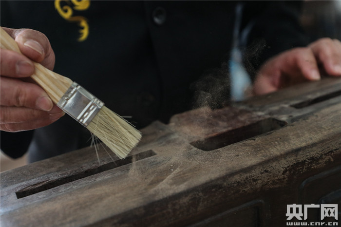 劉更生正在清理古舊家具殘件。(央廣網(wǎng)記者 韓靖 攝)