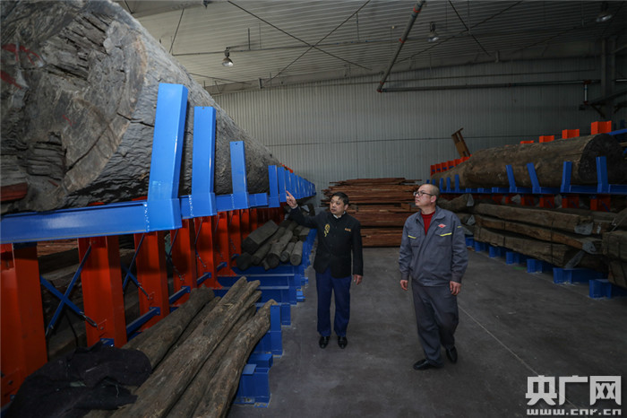 劉更生(左)和張?jiān)葡U跒榧揖咛暨x木料。(央廣網(wǎng)記者 韓靖 攝)