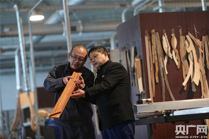 劉更生(右)和張?jiān)葡T跈z查木料的垂直度。(央廣網(wǎng)記者 韓靖 攝)