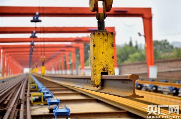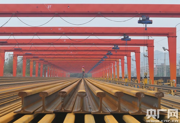在蘭州工務(wù)段河口南焊軌基地,記者看到,軌排長得像蜈蚣,但正是這些密密麻麻的“腿”支撐你我出行的路。(央廣網(wǎng)記者王晶 攝)