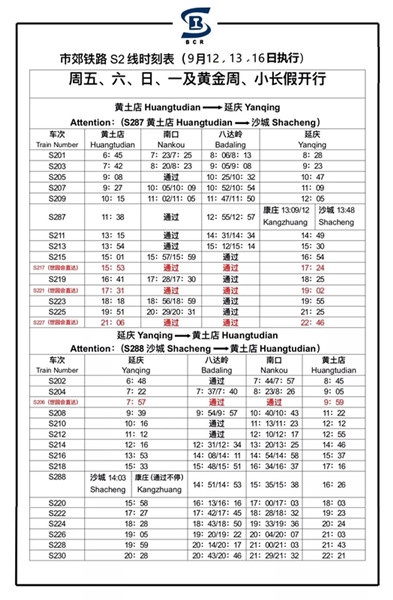 9月14日至9月15日,根據(jù)鐵路運(yùn)輸調(diào)整需要,S2線(xiàn)及懷柔-密云線(xiàn)部分列車(chē)停運(yùn)。