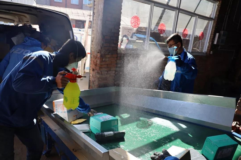 在快遞網(wǎng)點(diǎn),工作人員正在逐一對快件進(jìn)行消毒(央廣網(wǎng)發(fā) 中通快遞供圖)