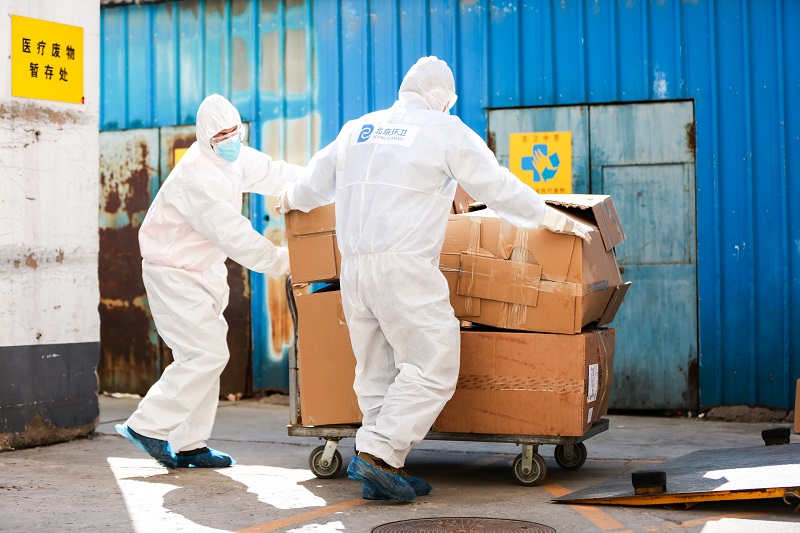 北京環(huán)衛(wèi)集團(tuán)固廢物流公司醫(yī)廢中心職工在清運(yùn)醫(yī)療廢棄物(北京環(huán)衛(wèi)集團(tuán)供圖)