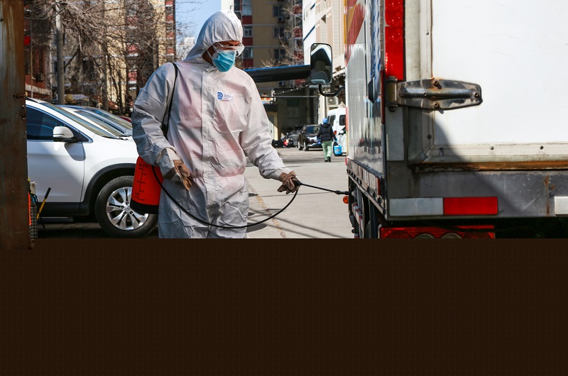 將醫(yī)療廢物裝車后,北京環(huán)衛(wèi)集團(tuán)固廢物流公司醫(yī)廢中心職工對(duì)作業(yè)車輛車身消毒(北京環(huán)衛(wèi)集團(tuán)供圖)