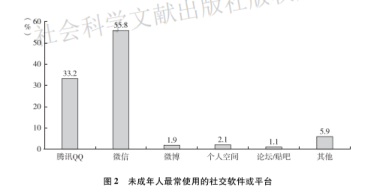 未成年人最常用的社交軟件或平臺(tái)柱狀圖(央廣網(wǎng)發(fā) 社科文獻(xiàn)出版社 供圖)