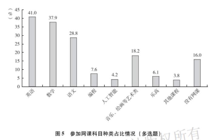 《藍(lán)皮書》進(jìn)一步指出,在參與網(wǎng)課的比例方面,各年級(jí)學(xué)生群體參與網(wǎng)課的比例均高于80%,且城鄉(xiāng)在網(wǎng)課普及率上差距不大。學(xué)習(xí)科目上,英語(41.0%)、數(shù)學(xué)(37.9%)和語文(28.8%)是未成年人在線學(xué)習(xí)的主要內(nèi)容,音樂、繪畫等藝術(shù)類科目,以及編程、樂高、人工智能等在線課程也受到未成年人和家長(zhǎng)的青睞。