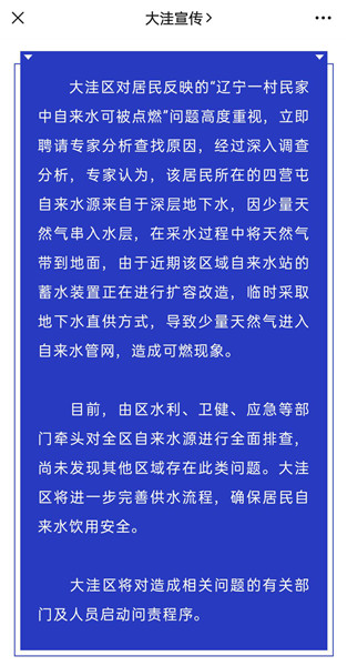 根據(jù)此前大洼區(qū)委宣傳部公布的調(diào)查結(jié)果,專家認為,該居民所在的四營屯自來水源來自于深層地下水,因少量天然氣串入水層,在采水過程中將天然氣帶到地面。近期該區(qū)域自來水站的蓄水裝置正在擴容改造,臨時采取地下水直供方式,導(dǎo)致少量天然氣進入自來水管網(wǎng),造成可燃現(xiàn)象。