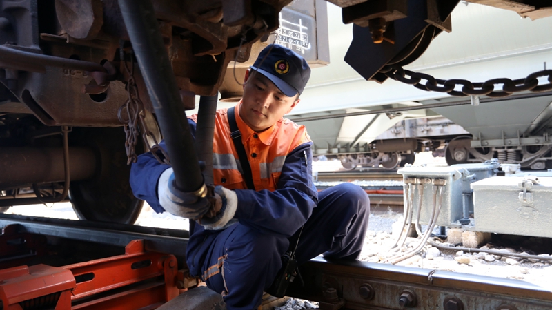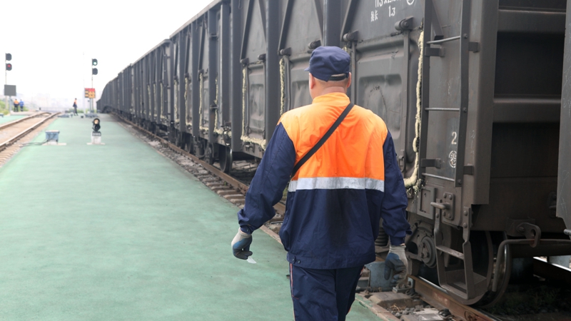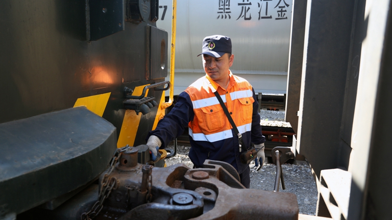 作為中國(guó)鐵路沈陽(yáng)局集團(tuán)有限公司管內(nèi)的編組站,金州站地處沈大鐵路、丹大快速鐵路和金窯、金城專用鐵路4條鐵路線交會(huì)處,站場(chǎng)由客場(chǎng)和運(yùn)轉(zhuǎn)場(chǎng)兩部分組成,主要承擔(dān)4條鐵路線的列車到發(fā)和解編作業(yè)。今年45歲的調(diào)車長(zhǎng)宋倫政,已經(jīng)在調(diào)車場(chǎng)上工作了十多個(gè)年頭。10時(shí)10分,調(diào)車組接到1調(diào)車組第4次調(diào)車作業(yè)計(jì)劃后,在1場(chǎng)7道掛46輛車,宋倫政帶領(lǐng)“鉤子手”從南走到北,對(duì)?康囊涣胸涍\(yùn)列車逐一進(jìn)行“勾、管、閘”檢查。