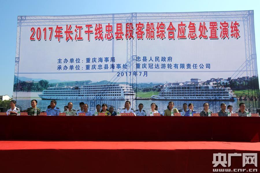 長江客船綜合應(yīng)急處置演練在重慶忠縣舉行(央廣網(wǎng)發(fā) 彭南祥攝) 當(dāng)天上午9時(shí)30分,演練正式開始。演練模擬涉外旅游客船“世紀(jì)寶石”輪,載客135人、船員115名,航行至忠縣石寶旅游碼頭水域時(shí),船舶六樓救生甲板失火,火勢迅速蔓延,船上旅客人身安全面臨嚴(yán)重威脅。船長立即向忠縣海事處報(bào)告,請求緊急救助! -