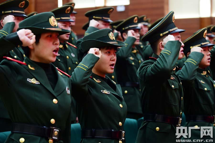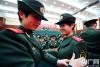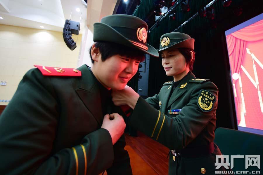 一名女戰(zhàn)士為直招士官佩戴臂章(央廣網(wǎng)發(fā) 馬士寶攝) -
