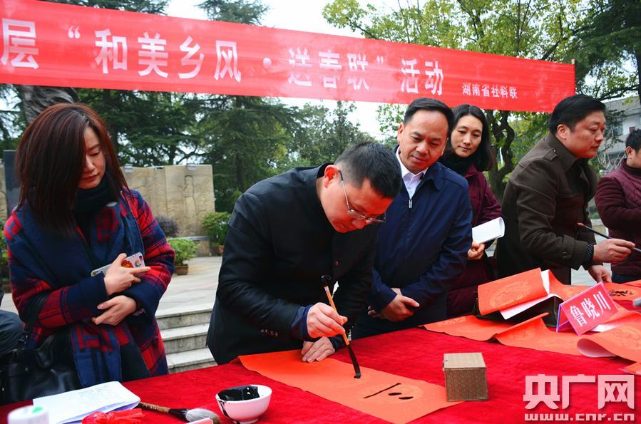 湖南省社科聯(lián)的書法家們現(xiàn)場潑墨,為群眾免費贈送春聯(lián)(央廣網(wǎng)發(fā) 劉法蘭攝) 央廣網(wǎng)懷化1月22日消息(記者堯遙 通訊員劉法蘭)雖說距離春節(jié)還有二十多天,可是年味已經(jīng)“冒”出了頭。近日,來自湖南省社科聯(lián)的書法家們在懷化市溆浦縣警予廣場現(xiàn)場揮毫潑墨,為群眾免費贈送上春聯(lián)和祝福。 此次書寫的春聯(lián)內(nèi)容,都是書法家首創(chuàng),每一副春聯(lián)就是一副書法作品,別具新意。“我們家是做生意的,希望來年生意興。 眮碜凿悠置裰鹘值氖姘⒁陶堉袊郝(lián)學會理事、湖南省楹聯(lián)家學會副主席魯曉川幫她寫一副春聯(lián)。 湖南省社科聯(lián)軟科學研究室、省社科普及助理研究員龍艷說,現(xiàn)在大家都習慣了上街購買春聯(lián),忽視了寫春聯(lián)的意義和樂趣!拔覀儼褍(yōu)秀文化送到群眾身邊,也送上最美好的祝愿。通過進基層送春聯(lián)的方式,讓群眾現(xiàn)場體會到書法的魅力,感受名家風采,喚醒群眾對傳統(tǒng)文化的記憶! 據(jù)介紹,今年的送春聯(lián)活動溆浦是第一站,接下來他們還將去到省級貧困村威虎山村,把春聯(lián)送到最基層。此外,湖南省社科聯(lián)每年都會舉行一系列的社科普及進基層活動,在特定的時間節(jié)點,開展不同的文化活動,加強傳統(tǒng)文化的宣傳,提升文化自信。