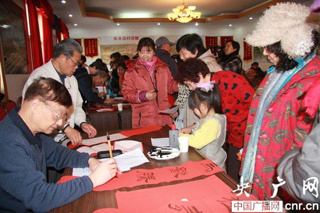 大廳里,鐵絲上懸掛著數(shù)百幅紅彤彤的春聯(lián)供村民挑選。十里八村的鄉(xiāng)親在挑選春聯(lián)時(shí)尤其對(duì)“追風(fēng)赤兔長(zhǎng)辛店;踏雪尋梅園博園“和“寶塔祥光映村社;園博生輝潤(rùn)田園格外青睞。活動(dòng)中,剛剛建成的長(zhǎng)辛店鎮(zhèn)園博書畫社揭牌。在隨后“草根書法家“文化入村行動(dòng)中,幾十名當(dāng)?shù)貢◥酆谜叱俗鴴煊小伴L(zhǎng)辛店文化大篷車,送福到農(nóng)家”的面包車分赴九個(gè)行政村為農(nóng)民寫春聯(lián)。