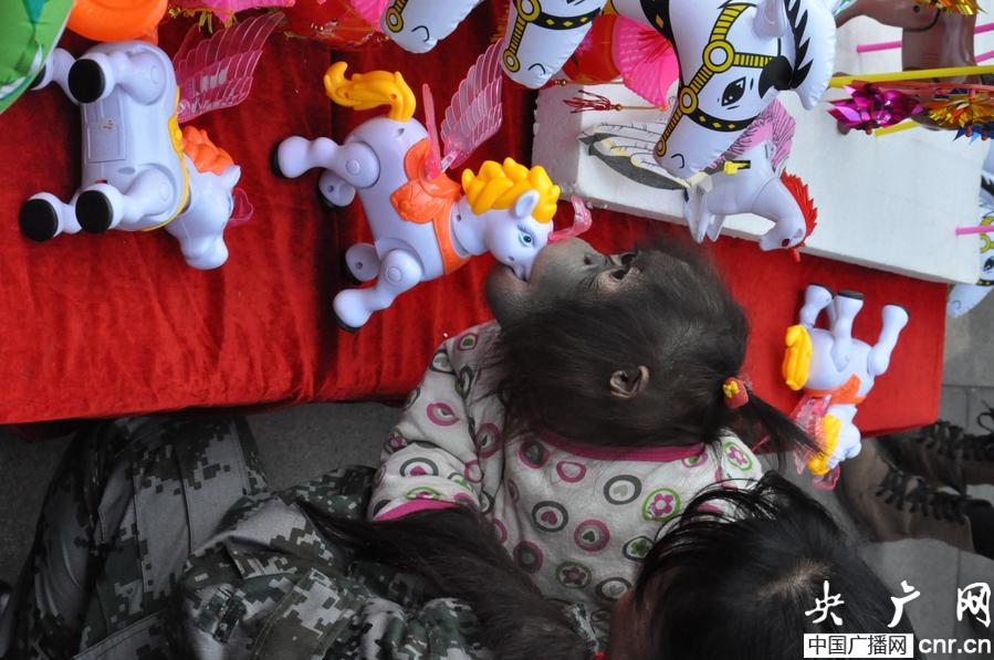 來到年貨街里,迎接動物們的就是一排排風(fēng)車和充氣小馬玩具。飼養(yǎng)員李大姐抱著毛毛在年貨攤前蹲下,讓毛毛自己挑選喜歡的禮物。毛毛看著一排排的禮物開始發(fā)愣了,它先用手摸摸充氣小馬,再用手摸摸風(fēng)車。最后,毛毛選了一個(gè)塑料做的小馬玩具。毛毛撅著嘴把小馬的頭含在了里面就把它抱在懷里。