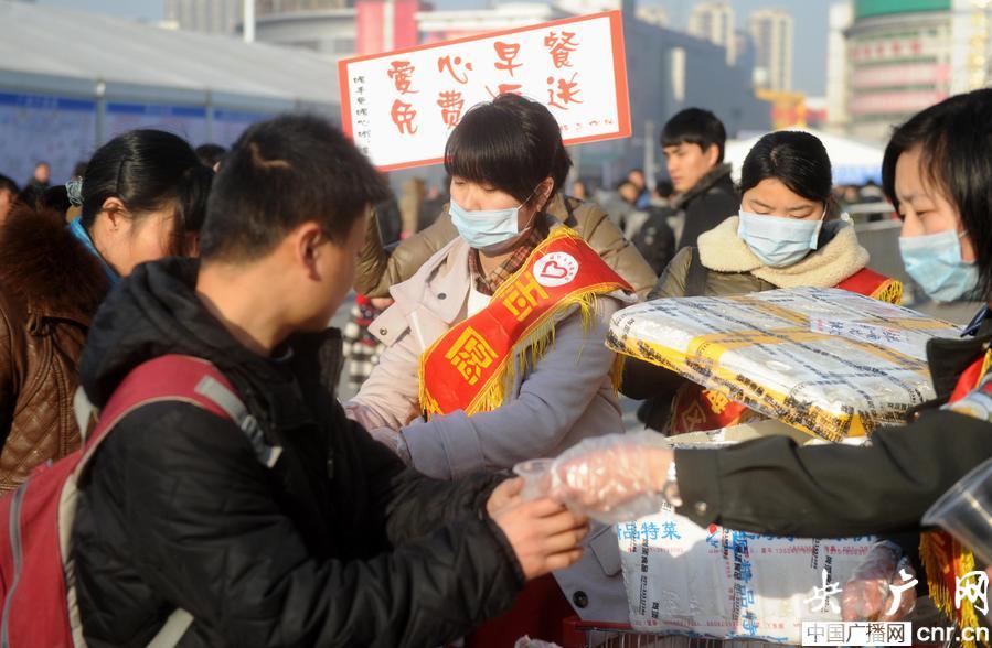 合肥市瑤海城管在火車(chē)站設(shè)立免費(fèi)早餐發(fā)放點(diǎn),溫暖旅客歸鄉(xiāng)路(央廣網(wǎng)發(fā) 解琛 攝)