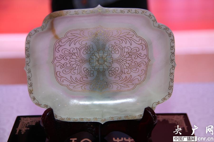 青白玉錯(cuò)金卷草紋海棠盤(pán)(央廣網(wǎng)記者 廉軍 攝)