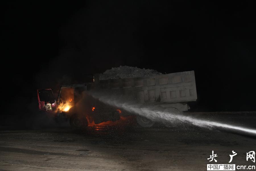 2時(shí)25分,黔江消防官兵抵達(dá)現(xiàn)場(chǎng)后發(fā)現(xiàn),一輛重型貨車停在工地道路上,駕駛室內(nèi)正冒著滾滾濃煙,空氣中彌漫著刺鼻的焦味,赤紅的火焰正燃燒著輪胎,時(shí)而發(fā)出噼啪聲響,濃濃的黑煙從汽車底部向外冒出,駕駛室火勢(shì)正在擴(kuò)大。一旦火勢(shì)蔓延到油箱后果將不堪設(shè)想,針對(duì)現(xiàn)場(chǎng)情況,消防官兵立即出一支水槍直擊著火點(diǎn),在泡沫水槍的攻勢(shì)下,10分鐘后貨車的火勢(shì)很快得到控制,為防止復(fù)燃,消防官兵對(duì)貨車冒煙部位進(jìn)行噴水冷卻。