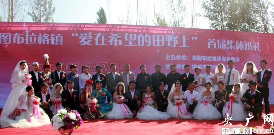 集體婚禮現(xiàn)場(chǎng),在浪漫音樂的輕奏下,鮮艷的國(guó)旗被藍(lán)天勾勒出美麗的輪廓,維、蒙、漢、哈、回5個(gè)民族12對(duì)新人和2對(duì)金婚夫婦手拉手在國(guó)旗下宣誓,放飛和平鴿,攜手倡導(dǎo)文明,守護(hù)和諧家園,祝福祖國(guó)安定和諧,F(xiàn)場(chǎng)還表演了《博爾塔拉我的愛》大型集體舞和傳統(tǒng)麥西萊甫舞蹈,婚宴則是用新疆民族風(fēng)味的大鍋?zhàn)ワ執(zhí)娲,充分體現(xiàn)了節(jié)儉辦婚禮。