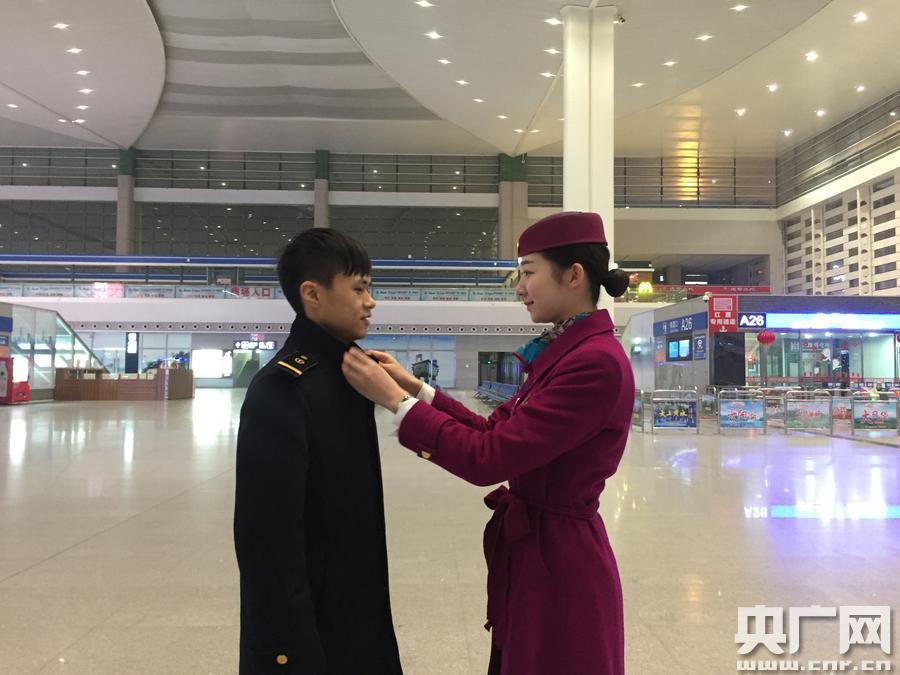 “90后”動(dòng)車情侶檔奮戰(zhàn)春運(yùn)奏響青春贊歌(李國(guó)建 曲麗娟攝) 央廣網(wǎng)重慶2月17日消息(記者劉湛 通訊員李國(guó)建 曲麗娟)“坤兒,這兩天又降溫了,在車上要多喝熱水,只有照顧好自己才能更好的服務(wù)旅客!”2月15日在成都東站的候車大廳里,剛退乘的動(dòng)車組隨車機(jī)械鄧鎰沁拉著馬上要出乘的列車員女友韓坤,在有限的時(shí)間里悉心叮囑著。 對(duì)于因動(dòng)車而結(jié)緣的“90后”情侶檔鄧鎰沁和韓坤來說,2017年的春運(yùn)是忙碌而充實(shí)的。雖然同在動(dòng)車上工作,卻因值乘交路和倒班時(shí)間不同,他們聚少離多。今年春節(jié),他們連一天“對(duì)上”一起過節(jié)的時(shí)間都沒有,除夕和元宵,都是各自在動(dòng)車上陪伴旅客度過。 26歲的鄧鎰沁是成都動(dòng)車段的一名動(dòng)車組隨車機(jī)械師,因每天的工作是在動(dòng)車運(yùn)行中管理和操作動(dòng)車組設(shè)備,監(jiān)控動(dòng)車運(yùn)行狀態(tài),緊急處理途中發(fā)生的突發(fā)故障,所以被稱為動(dòng)車組“隨車醫(yī)生”。春運(yùn)期間,“隨車醫(yī)生”鄧鎰沁就是這樣在一列列疾馳的動(dòng)車上時(shí)刻巡查監(jiān)控,保障著旅客們的平安出行。 鄧鎰沁的女友韓坤,今年21歲,是成都客運(yùn)段動(dòng)車三隊(duì)的一名高鐵列車員,在列車上為旅客提供優(yōu)質(zhì)、溫馨的服務(wù),因此她被旅客親切的稱呼為“動(dòng)妹兒”。旅客上車前,她要仔細(xì)檢查每個(gè)人的車票,防止有人錯(cuò)乘;旅客上車后,她要幫忙搬放行李,以防行李掉落誤傷旅客;途中要按時(shí)播報(bào)站名,以防旅客坐過站……這就是“動(dòng)妹兒”韓坤的春運(yùn)。 “還記得在兩年前的春運(yùn)中,當(dāng)時(shí)我們正好都在同一班列車上值乘,第一眼看見她,我就認(rèn)定她了!编囨勄哒f,今年的春運(yùn)是他們相戀兩周年的紀(jì)念日。雖然兩年里,因?yàn)楣ぷ餍枰,兩人?jīng)常值乘在不同的列車上,見面的時(shí)間越來越少,有時(shí)候兩人在車站遇見,卻是一個(gè)剛退乘,另一個(gè)要馬上出乘,只能簡(jiǎn)單的彼此問候一下便奔赴崗位!安畈欢嗝總(gè)月我們‘共同’休息的時(shí)間只有一天,雖然很短暫,但我們很滿足。”韓坤說。 盡管聚少離多,但鄧鎰沁和韓坤這對(duì)“90后”情侶檔卻一直很樂觀向上,相聚的時(shí)間他們總是倍加珍惜。生活中他們相濡以沫,工作中他們互相鼓勵(lì),有困難他們互相支持。過去,他們因動(dòng)車相識(shí);現(xiàn)在,他們?cè)趧?dòng)車上相戀,未來,他們要在動(dòng)車上相守! 春運(yùn)期間,為了確保千萬旅客的回家路,在成都動(dòng)車段還有著許多像他們這樣的夫妻檔、情侶檔,時(shí)刻以“擔(dān)當(dāng)、嚴(yán)謹(jǐn)、務(wù)實(shí)、創(chuàng)新”的精神激勵(lì)著自己,將火熱的青春和美麗的夢(mèng)想融進(jìn)每一列安全、優(yōu)質(zhì)的動(dòng)車中;用堅(jiān)守崗位、恪盡職守、無私奉獻(xiàn)奏響著動(dòng)車人的青春贊歌!