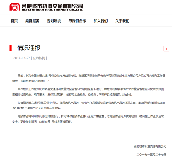 央廣網(wǎng)合肥3月28日消息(記者徐鵬)日前,針對合肥軌道交通1號(hào)線雜散電流監(jiān)測電纜、隧道區(qū)間疏散指示電線所用陜西奧凱電纜有限公司產(chǎn)品的再次檢測工作已完成。3月27日傍晚,合肥城市軌道交通有限公司在其官方網(wǎng)站發(fā)布《情況通報(bào)》: