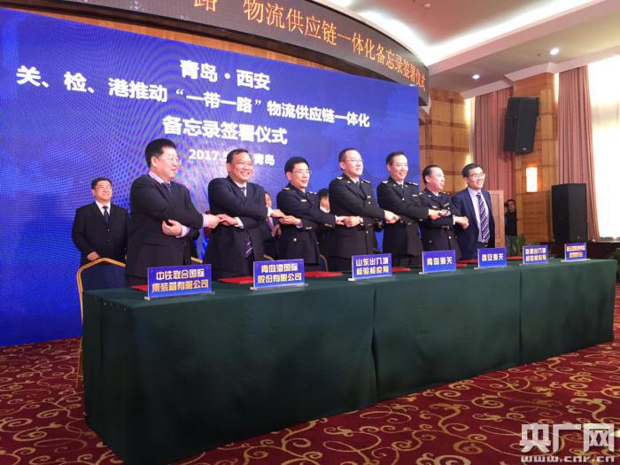 青島海關(guān)、西安海關(guān),山東出入境檢驗檢疫局、陜西出入境檢驗檢疫局,青島港、西安國際港務(wù)區(qū)及中鐵聯(lián)合國際集裝箱有限公司七方共同簽署推動“一帶一路”區(qū)域物流供應(yīng)鏈一體化倡議。提出要推動實現(xiàn)海鐵聯(lián)運、海陸聯(lián)運、空鐵聯(lián)運等多種運輸方式無縫銜接和資源共享。圍繞國際物流供應(yīng)鏈,打造一體化物流服務(wù)平臺,整合信息數(shù)據(jù)資源,建立“業(yè)務(wù)協(xié)同、信息共享”的物流服務(wù)機制,培育發(fā)展服務(wù)“一帶一路”的大型物流企業(yè)集團,提升現(xiàn)代物流業(yè)服務(wù)能力和水平。