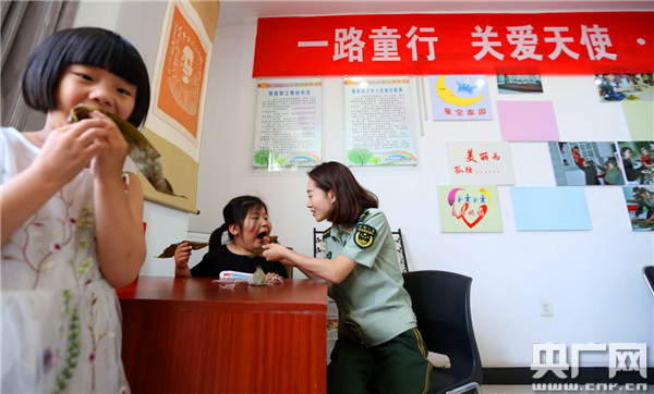 活動(dòng)期間,軍醫(yī)們?yōu)楹⒆觽儙チ唆兆、繪本和常備藥品。他們還親手為孩子剝粽子,給孩子講故事,陪孩子一起嬉戲玩耍,與這群特殊孩子建立了深厚的感情。