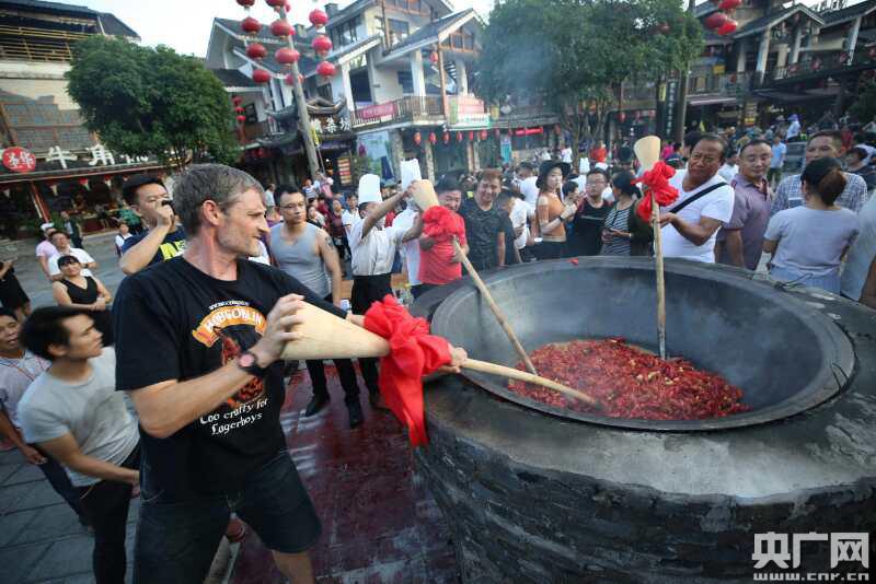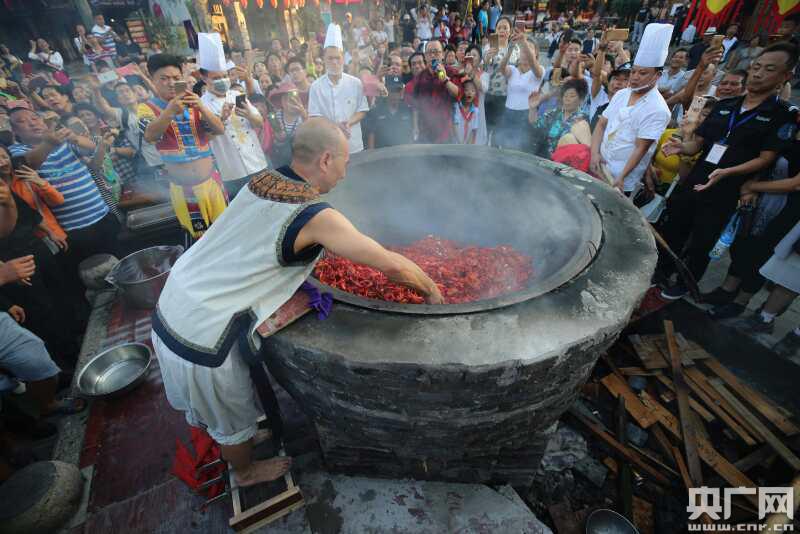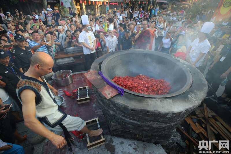 央廣網(wǎng)張家界9月28日消息(記者傅蕾 通訊員吳勇兵)9月26日,在湖南張家界市武陵源區(qū)非遺體驗(yàn)基地溪布老街,當(dāng)?shù)孛耖g藝人唐承剛雙腳踩在鋒利的刀刃上,徒手在直徑2米、溫度近260度的油鍋里炒龍蝦,向中外游客展示民間技藝。