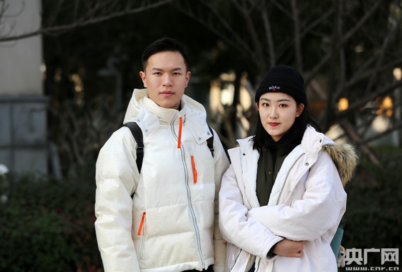1月24日,來自河北秦皇島的考生韋懿寧(右)在結束最后一場考試后和同學在浙江傳媒學院留影。(央廣網(wǎng)記者 魏煒 攝)