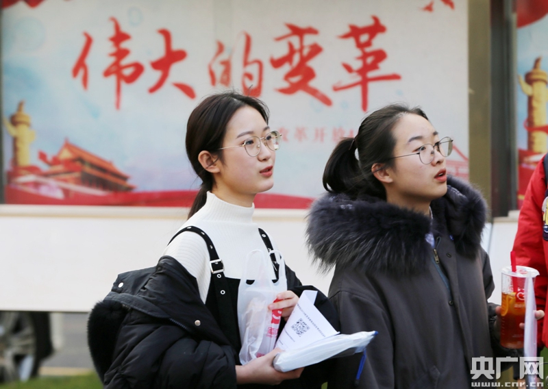 1月24日,兩位考生準備進入考場進行最后一場考試。(央廣網(wǎng)記者 魏煒 攝)