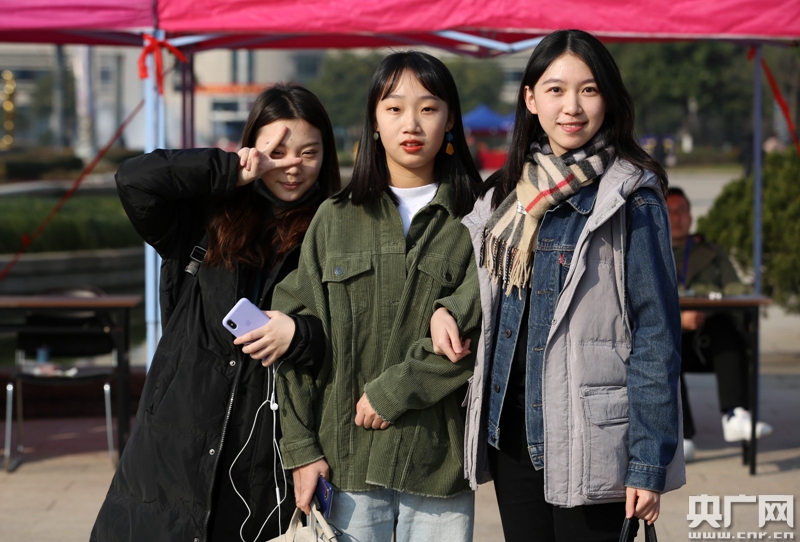 1月23日,來自山西太原的考生詹鈺珺(右)在考點和同學合影。(央廣網(wǎng)記者 魏煒 攝)