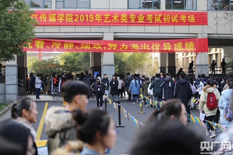 央廣網(wǎng)杭州1月25日消息(記者魏煒 謝夢潔 曹露浩)1月23-24日, 浙江傳媒學院2019年藝術類專業(yè)校考初試開考,記者在杭州考點看到,考試現(xiàn)場人山人海,帥哥美女“扎堆”出現(xiàn)。據(jù)悉,該院報考人次較去年任有小幅上漲,其中廣電藝術類專業(yè)報考近78000人次,報考人次最多的專業(yè)依次為播音與主持藝術(15000余人次)、廣播電視編導(14000余人次)、廣播電視編導(媒體創(chuàng)意)(9600余人次)。杭州點因考試人次較多,總人次超過32000,特別設置了浙江傳媒學院杭州下沙校區(qū)和杭州電子科技大學兩個考點。