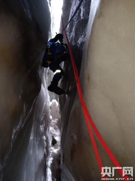 通過失蹤者的足跡,救援人員在海拔4900米處找到了一處冰川冰縫,懷疑失蹤者掉入了冰縫。冰縫長(zhǎng)度70米左右,深度約30米。狹窄的冰縫給救援帶來了不小的困難,冰縫地面寬度1米,但內(nèi)部越來越窄,最窄處僅20厘米。22日下午,在距離地面30米的冰縫底部,找到失蹤的寶某,但不幸的是,寶某已經(jīng)沒有了生命體征。