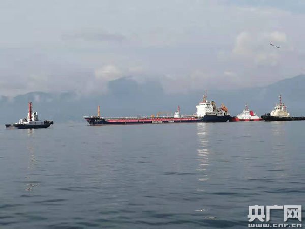 失控船“常豐油12”輪在四艘拖輪拖帶、海事執(zhí)法船全程護航下起錨進港。(圖片由惠州海事局提供)